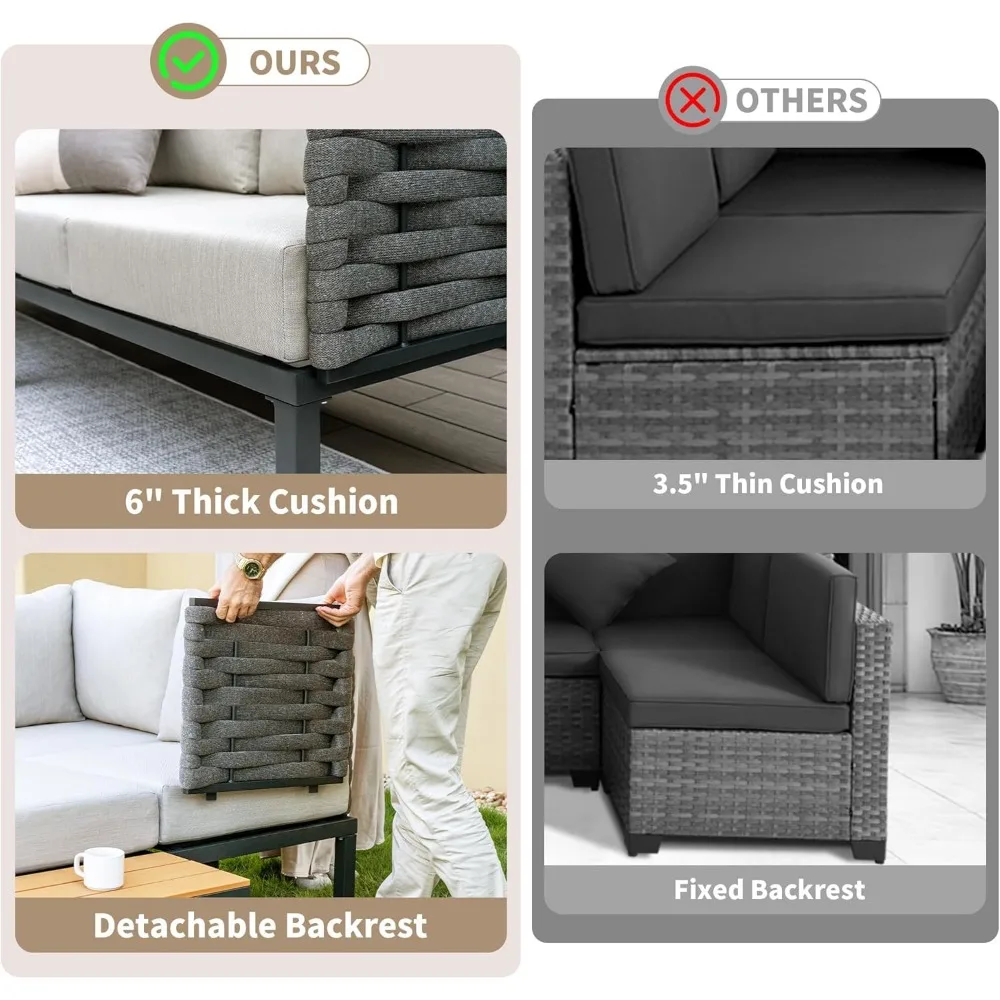 8-PIECE COMPLETE PATIO SOFA SET - Featuring a clean modern design, this outdoor patio furniture brings a simple but fashionable look to your space, such as patio, backyard, poolside. It's perfect for enjoying leisure time or having conversations with friends and family. 6" ULTRA THICK CUSHIONS - Pressure distribution is key to ensuring comfort over long hours, and it is heavily influenced by seat material. Designed with a 6-inch high density 25D foam and 3-layer construction, bring the ultra-soft and dense foam provides optimal pressure relief. This also makes the cushion incredibly resilient to sagging and deformation, helping it bounce back from heavy use-whether you're entertaining or simply unwinding. MULTI COMBINATION OPTIONS - Specially designed detachable armrests of the patio sectional sofa for a free combination. You can add or remove the armrests according to your needs such as a outdoor conversation set or poolside lounge daybed. Moreover, 2 side tables can be utilized independently or together, enhancing the overall functionality and adaptability of your outdoor space. STURDY AND DURABLE - Made of olefin fabric and supported by powder-coated metal, this outdoor sofa set takes the advantage of water repellence and anti-aging performance while bearing a 300 LBS weight capacity. Adjustable feet at the bottom of the loveseat and couch sofa set help with uneven surfaces to keep the furniture stability. EASY QUCIK ASSEMBLY - 8 pieces sofa patio set is super easy to assemble with clear instructions and all necessary accessories included. The only need is to align the screw holes and make sure to tighten the screws only once all holes are aligned and secured.
