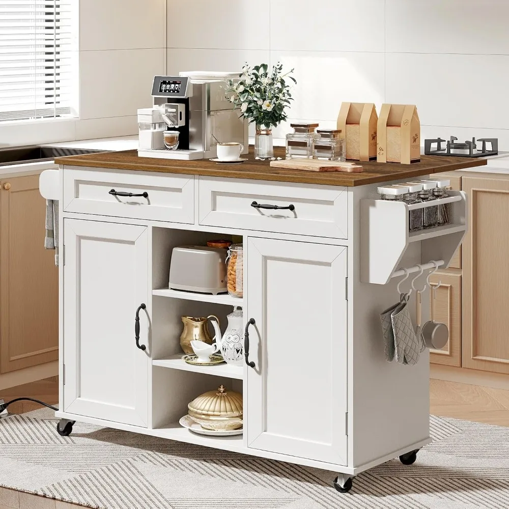 - Massive Storage Options: Beyond its generous countertop, this kitchen island includes 2 drawers, cabinets with spice racks, open compartments, and a towel rack, ensuring organized and accessible kitchenware and utensils, keeping your space tidy