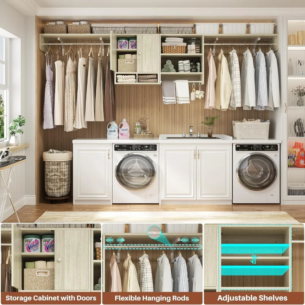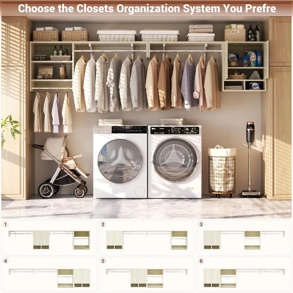 Multi-Purpose Closet System with 3 Hanging Rods, 5-10Ft Closet Organizer with Cabinet and Open Storage, Wood Closet Orga