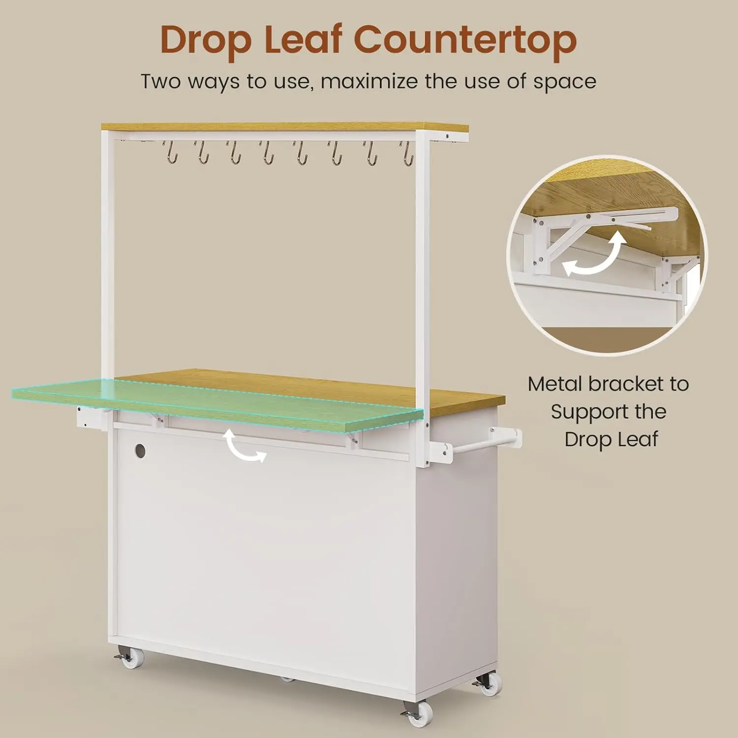 【Expandable Drop Leaf Workspace】The kitchen island cart features a foldable drop leaf countertop that extends from 15.7" to 26.8" wide, providing ample space for meal prep, dining, or entertaining. Supported by reinforced metal brackets, the expanded surface remains stable for chopping, mixing, or serving. When folded, the compact design saves space, making it ideal for smaller kitchens. - 【Multi-Level Storage Solutions】Organize your kitchen effortlessly with a trash storage cabinet, large drawers, and storage cabinet. Drawer for storing utensils and dinnerware. storage cabinet accommodate tall items like pots or small appliances, and the spice/towel rack keeps essentials within reach. Tilt-out trash storage cabinet which fits up to 10 Gallon Trash Can.