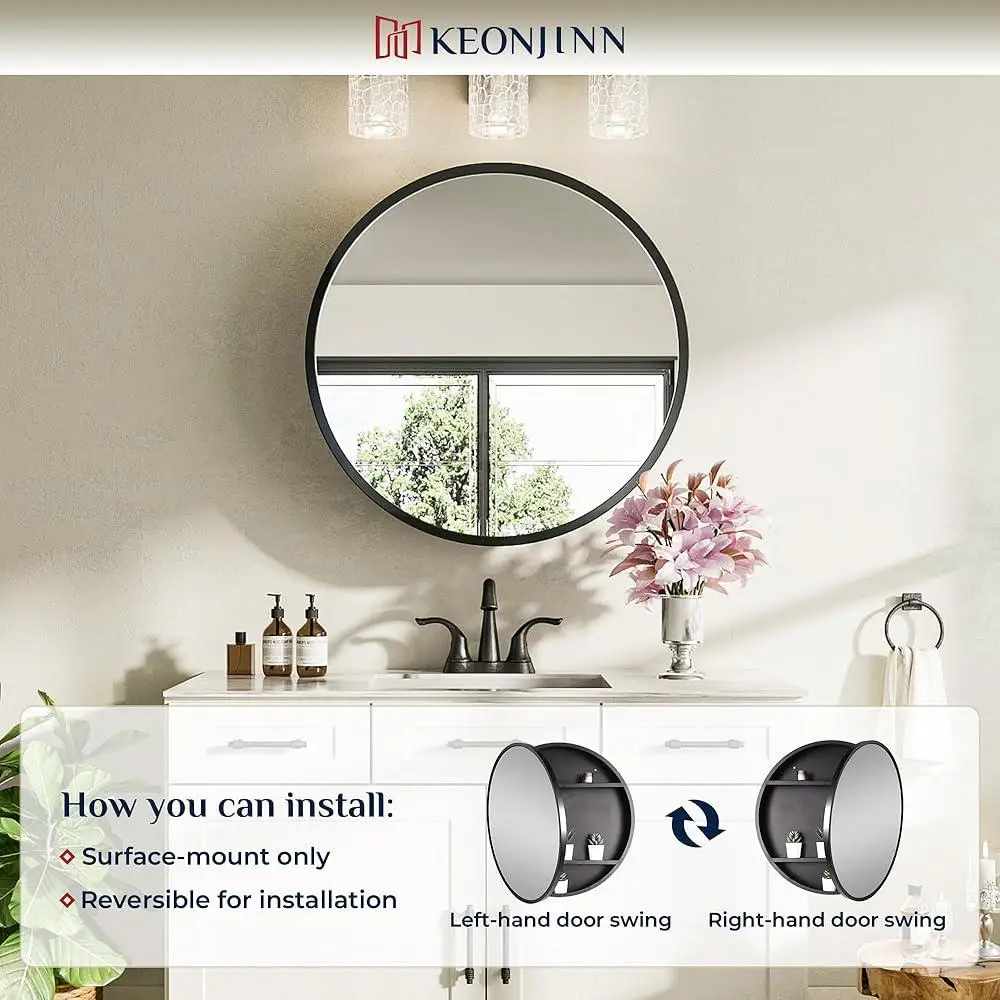 About this item The detachable shelves & dividers inside this round black medicine cabinet enable you to adjust the interior layout to your liking. Enjoy an effortless organization solution with our wall mount mirrored medicine cabinet. Please note that the recessed installation is NOT supported. The black bathroom medicine cabinet with mirror for wall offers a smooth door operation, facilitated by a piano hinge and magnetic bumpers, ensuring both its durability and refined aesthetics. Besides, featuring magnetic bumper at the door of farmhouse medicine cabinet, the round medicine cabinet can be closed tighter, preventing the door from slamming. With a solid Metal construction, Keonjinn bathroom medicine cabinet with framed mirror promises high strength and rust resistance, which protect mirror glass from impacts and enhance the resilience of the modern medicine cabinet against daily wear and tear. Select from a range of sizes and versatile colors to suit your bathroom décor such as modern or farmhouse style by our bathroom mirror with storage. With seamless semi-gloss finishes and an organic aesthetic, our Metal framed medicine cabinet with mirror seamlessly blend into any space. Keonjinn circular wall mount medicine cabinets for bathroom can be installed on various wall types, including drywall, brick, concrete block, wood paneling, etc. The vanity medicine cabinet with mirror hangs perfectly either to the left or to the right. Note: it can only be surface mounted. As the leading brand in the mirror category, we have been committed to providing consumers with desirable quality. Broken mirrors or missing medicine cabinet parts can be resolved by sending us some pictures.